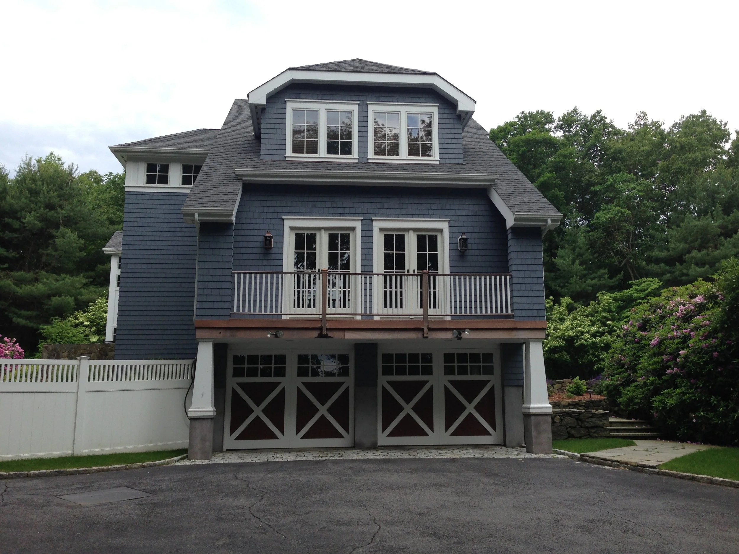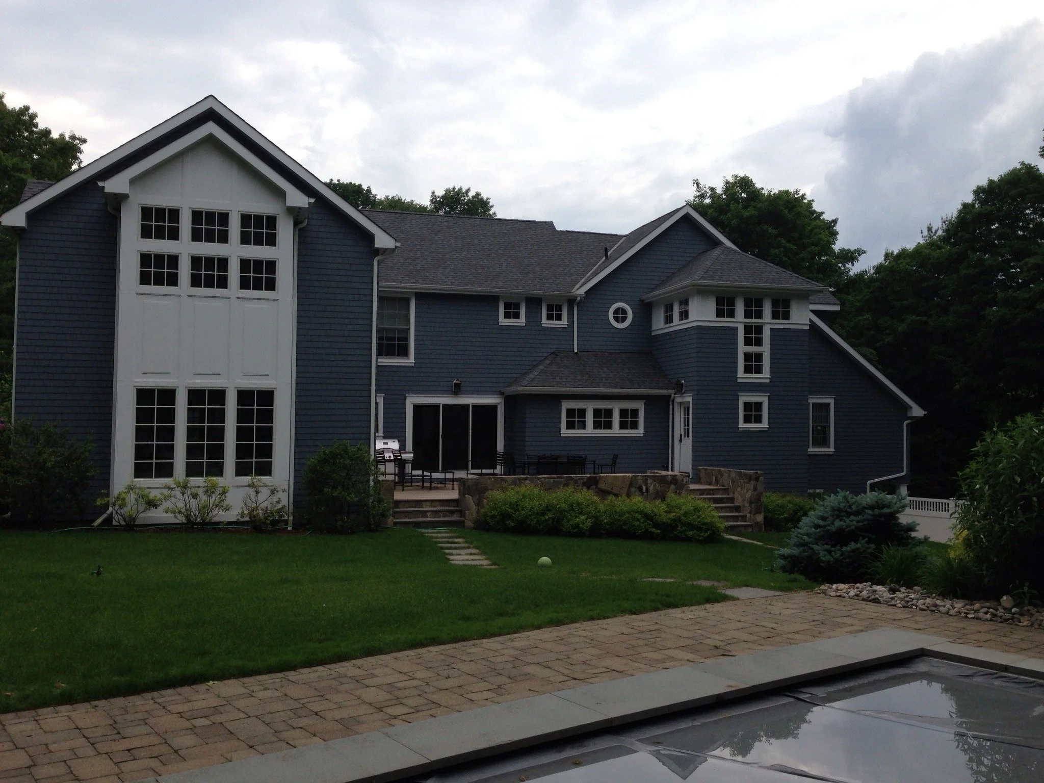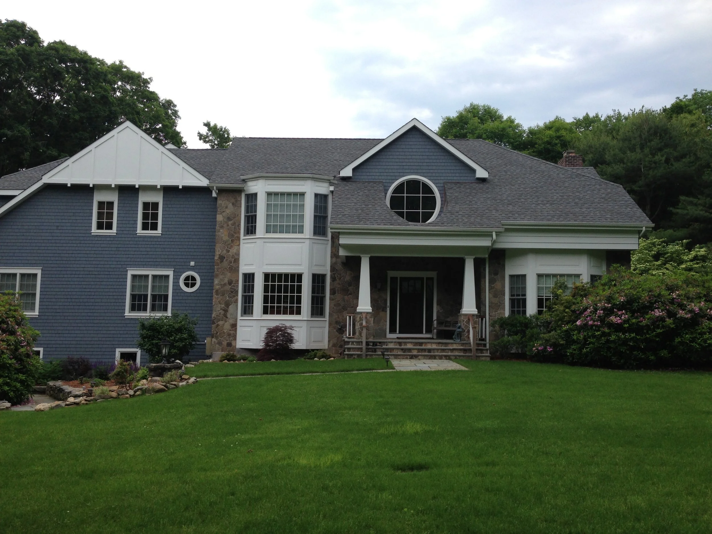J.A.C. Building & Development Group served as the general contractor for this extensive transformation of a dated colonial into a fully modernized, expanded residence. The project doubled the home’s square footage and introduced a refined exterior palette featuring asphalt and copper roofing, cedar shingles, a new stone façade, and detailed architectural paneling.