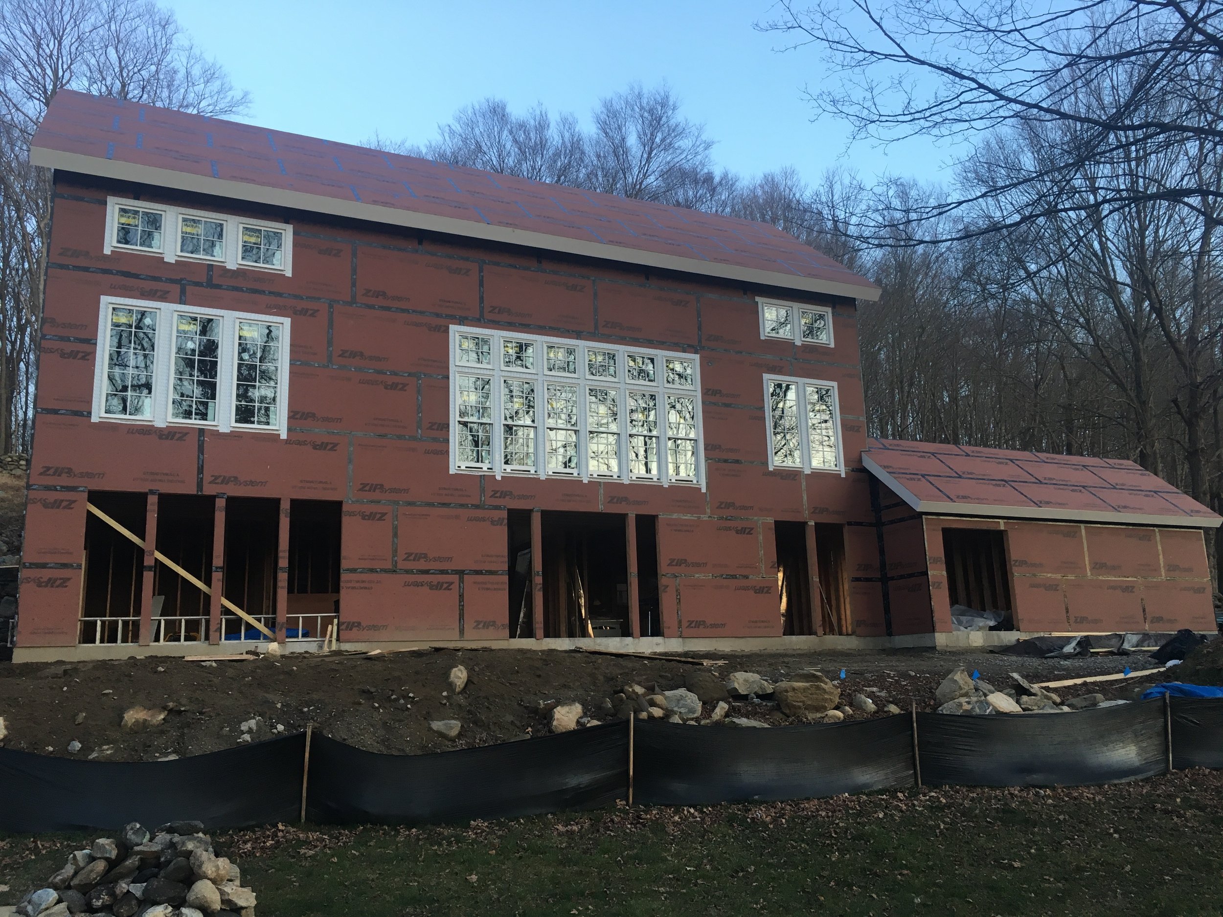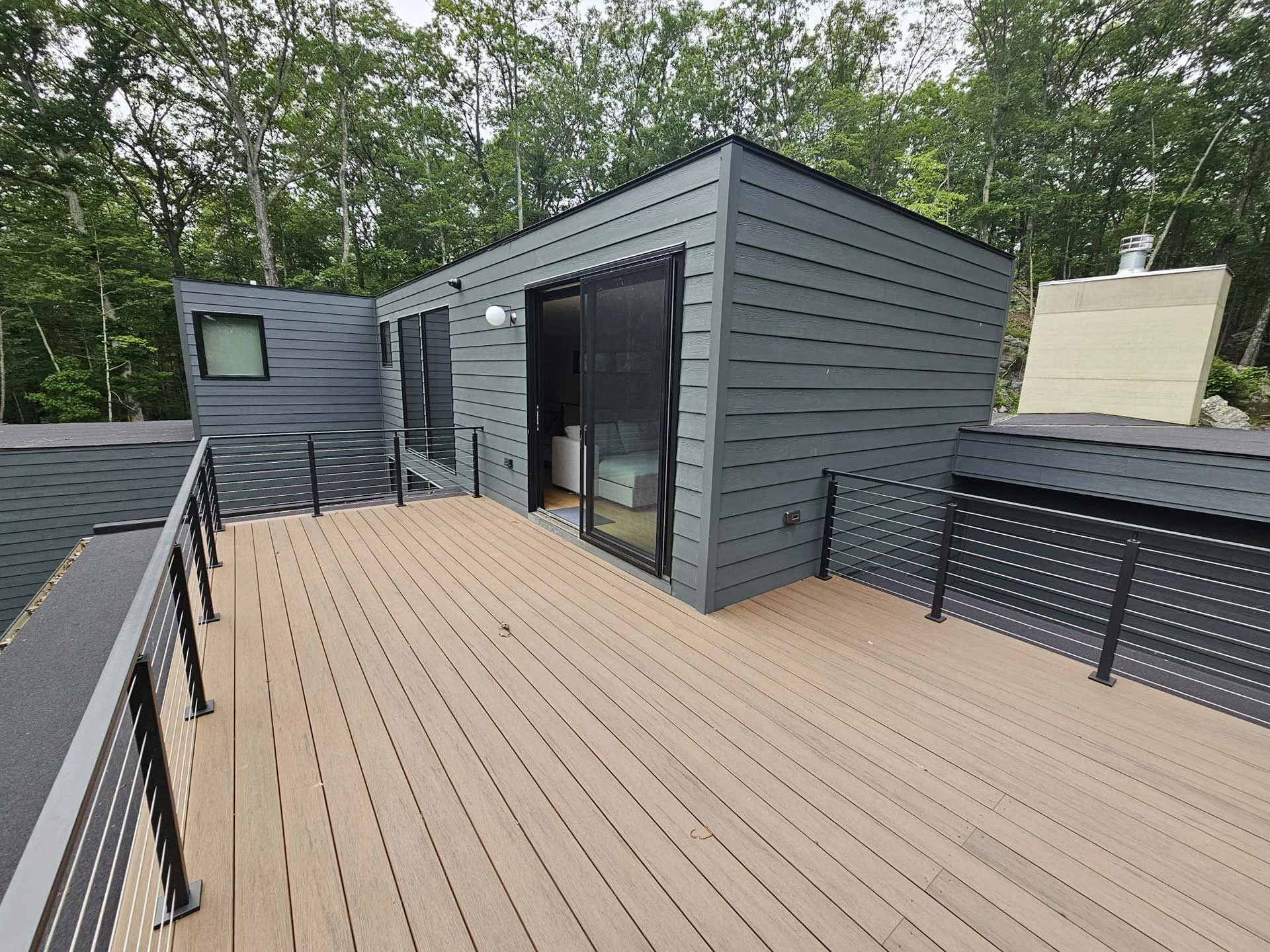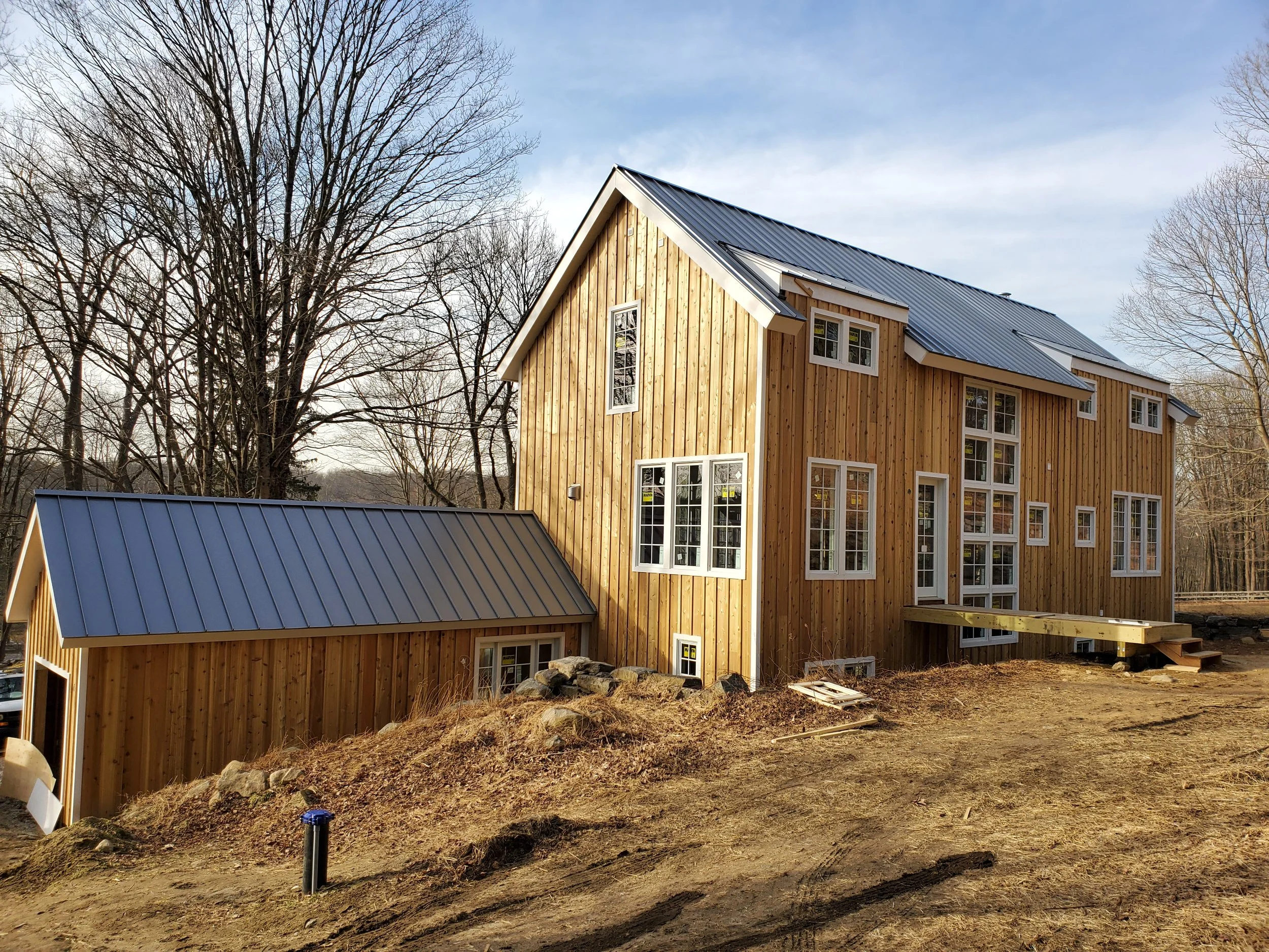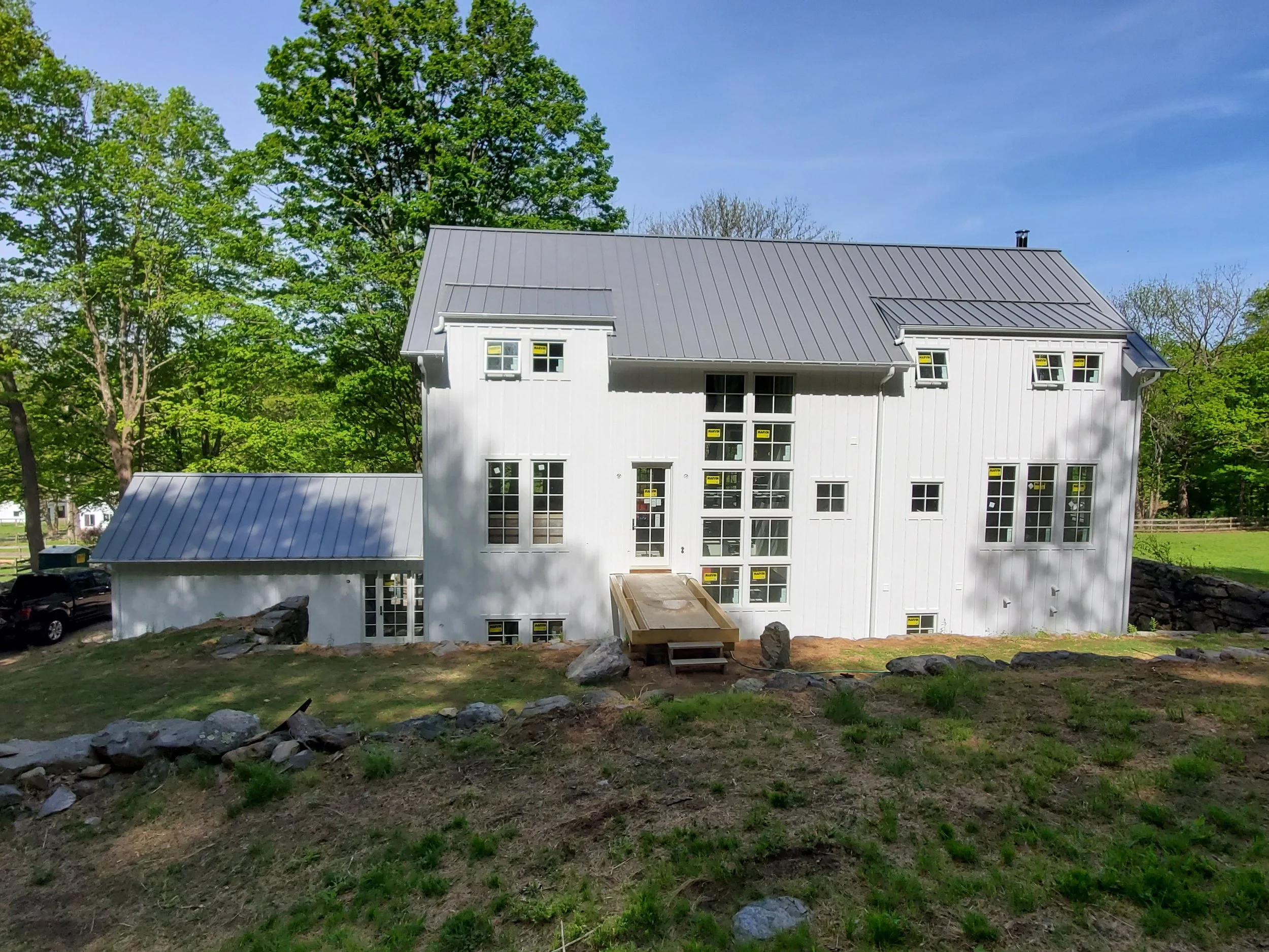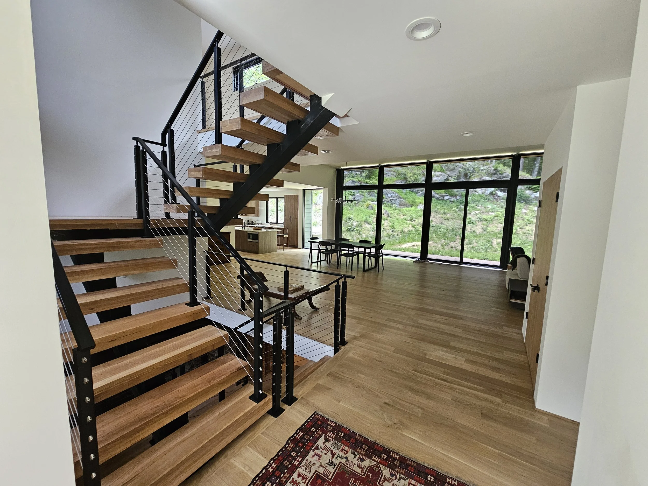 J.A.C. Building & Development Group served as both project manager and general contractor for this three‑story modern farmhouse set within a wooded Westchester landscape. The home features large floor‑to‑ceiling windows, steel stair stringers, and a standing‑seam metal roof that reinforces its contemporary farmhouse character. Expansive views of the surrounding woods, along with sightlines toward the property’s barn and horses, create a strong connection to the natural setting. Built with disciplined craftsmanship and modern detailing, the residence delivers a refined blend of rural charm and clean, modern design.