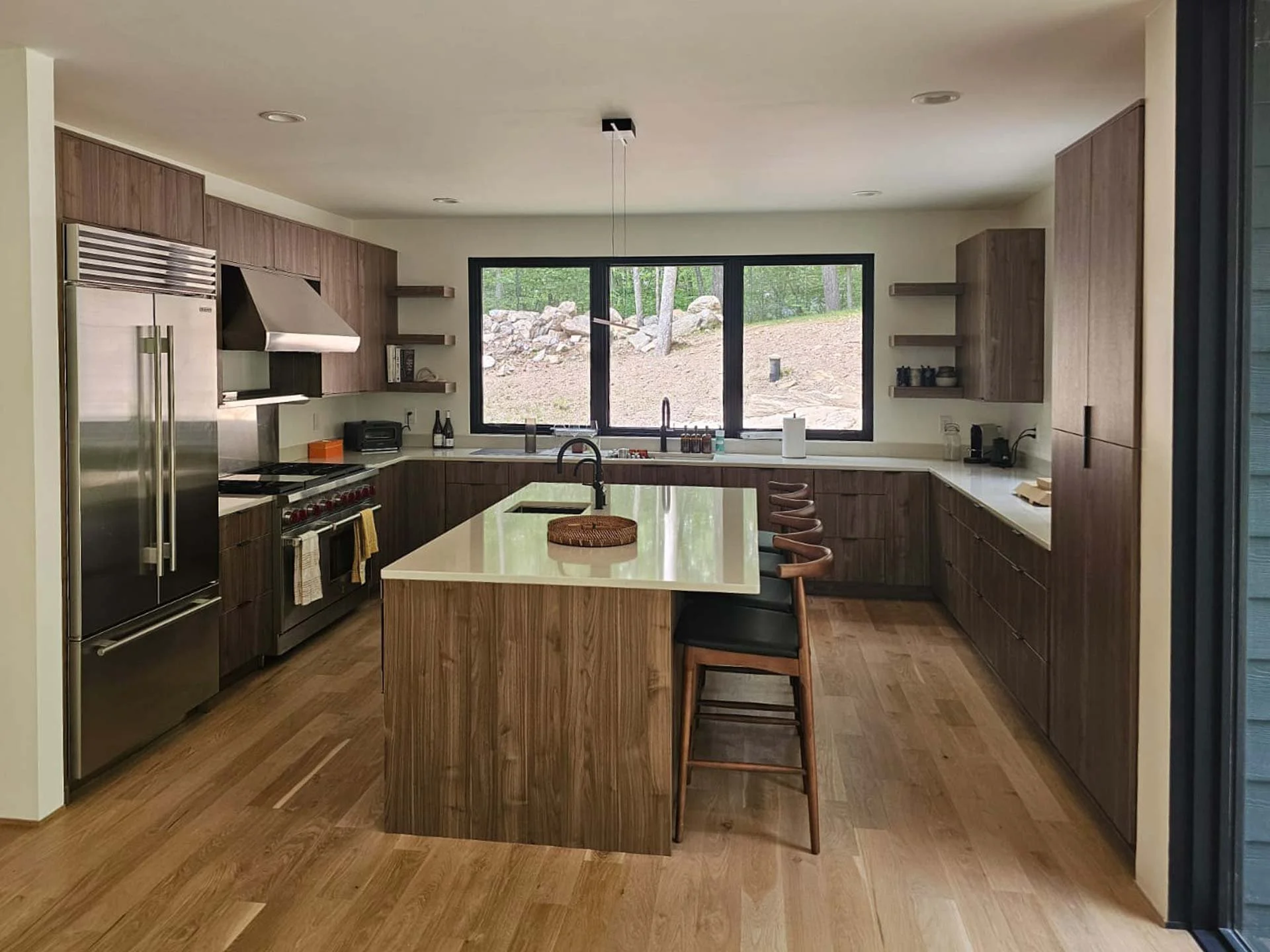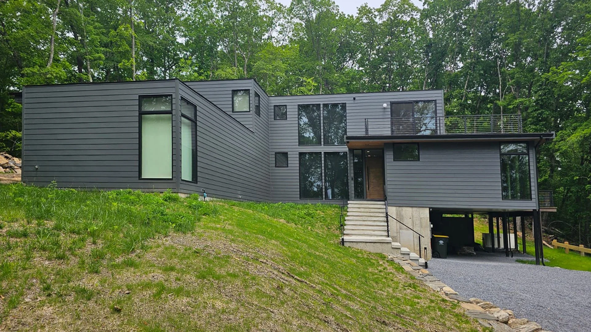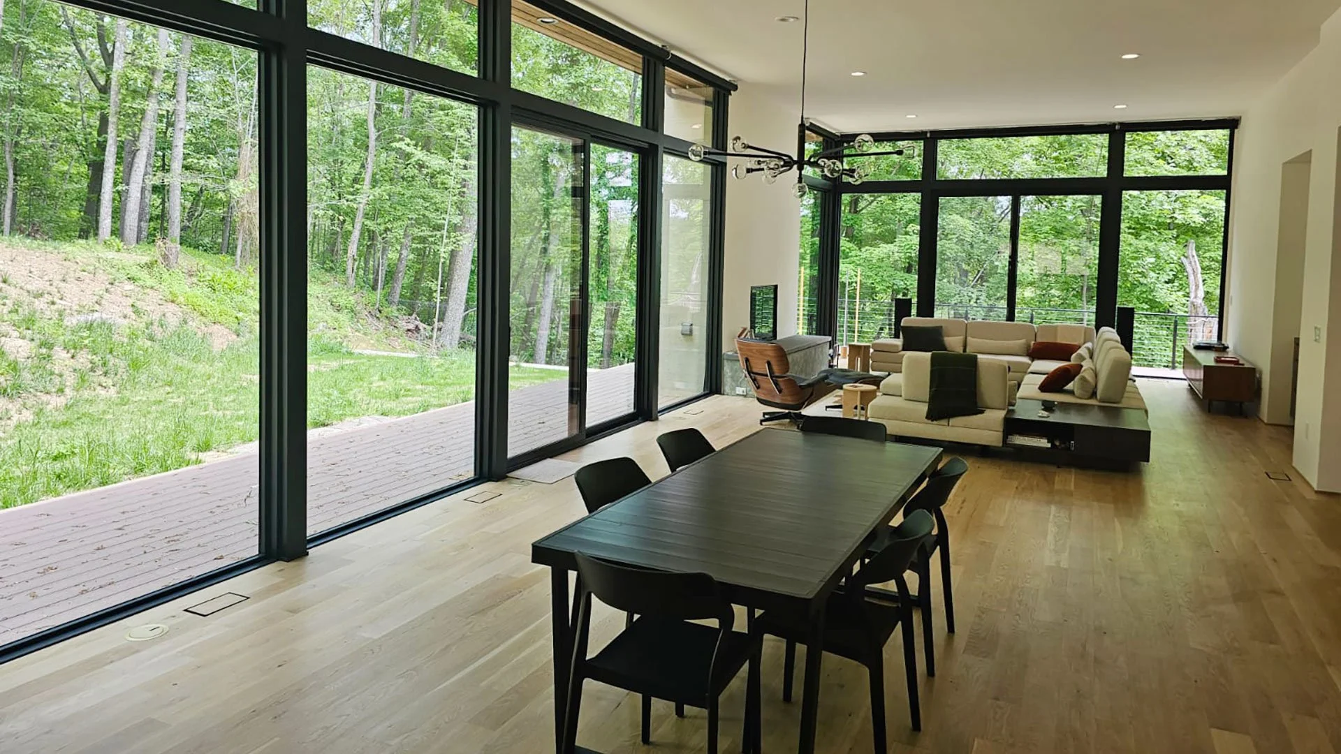 From an untouched four‑acre wooded parcel, this project delivered a fully custom modern residence designed to immerse its owners in the surrounding landscape. The home features expansive wrap‑around decking, floor to ceiling windows showing sweeping forest views, and warm natural wood details that carry throughout the interior. With three bedrooms and four baths, the layout offers generous living space supported by a chef’s kitchen, a spa‑inspired European shower, and a custom hydraulic‑lift TV system. Built with meticulous craftsmanship, the home balances contemporary design with comfort, functionality, and a strong connection to nature.